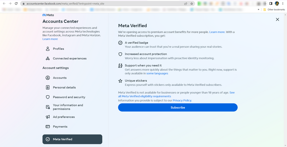 Your meta verified benefits (including support access) only apply to your subscribed facebook page, instagram account or whatsapp phone. Find out about the meta verification process to get an official blue tick added to your meta business portfolio on facebook and instagram business.