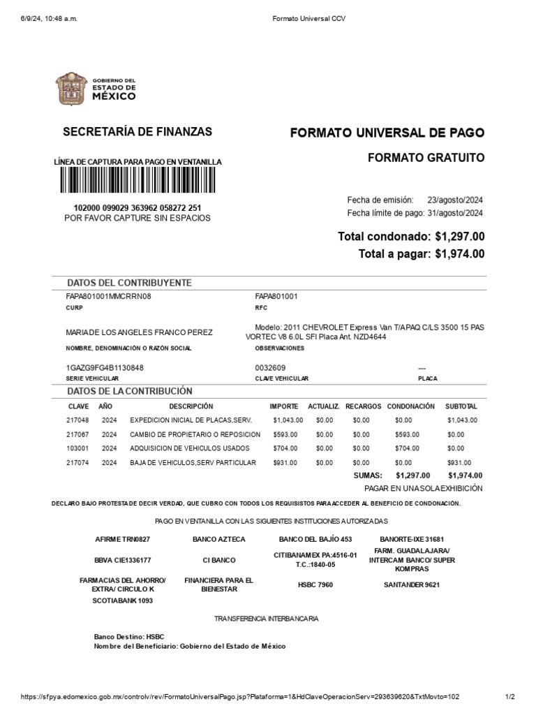 Formatos de Pago de Tenencia PDF Bancos Economias