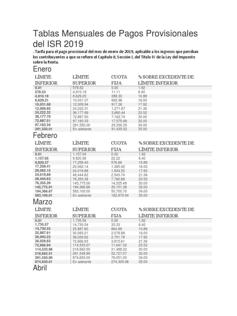 Tablas Mensuales de Pagos Provisionales Del ISR 2019 PDF Finanzas