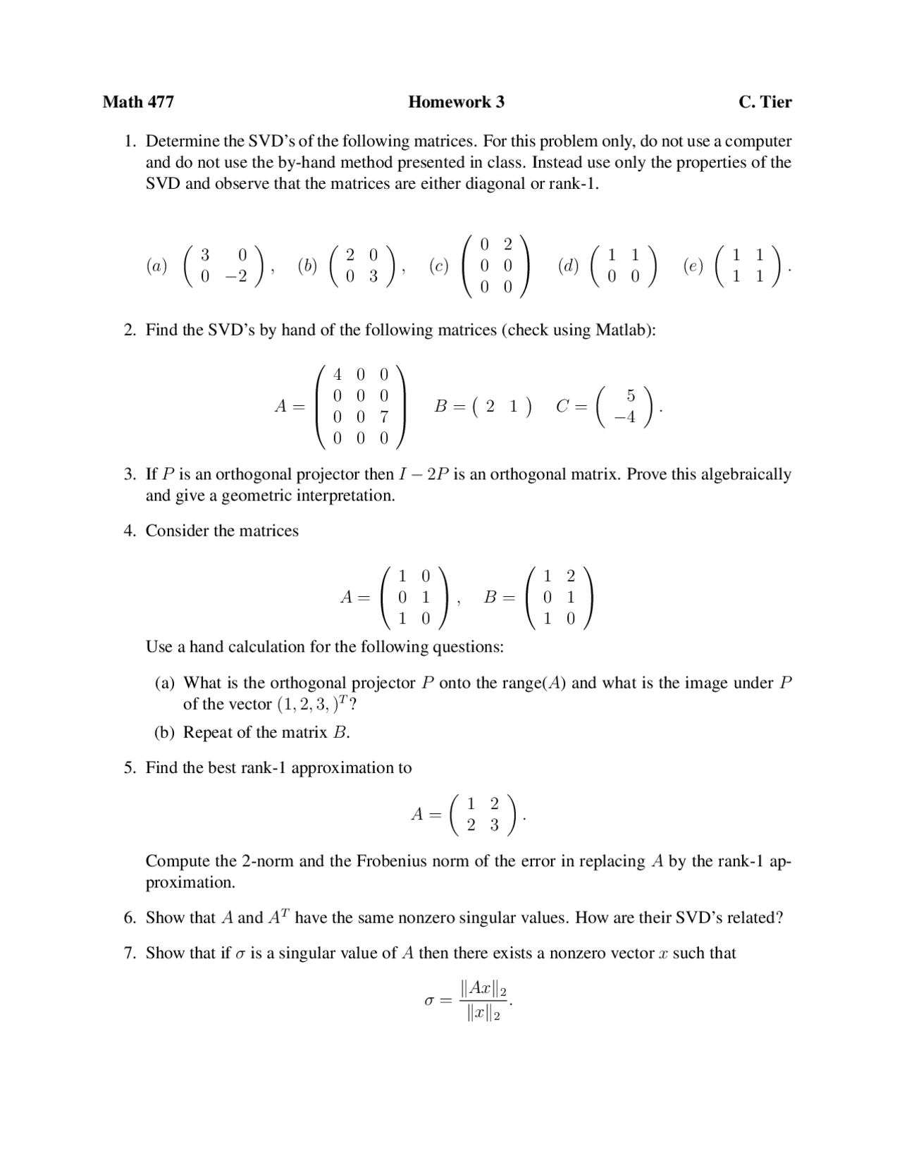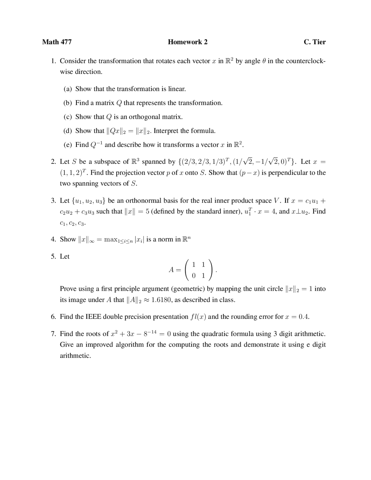 Homework 2 Questions Numerical Linear Algebra MATH 477 Docsity