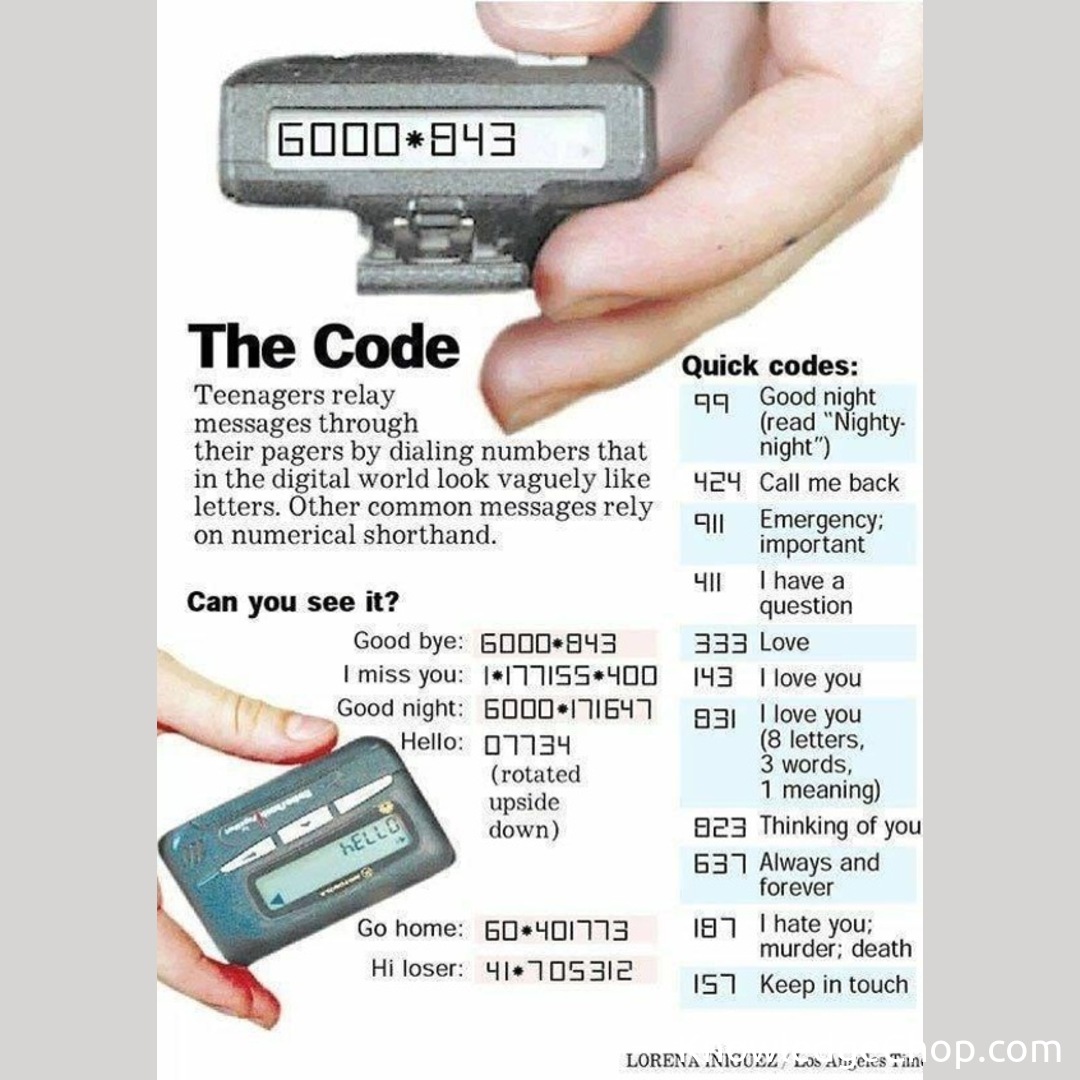 Nevertheless, here's an la times sidebar that shows the codes kids used to chat via pager back in the day. I don't know any who did. There are/were several types of pager codes in the 1990's before cellphones become common with inexpensive data/text plans. My best friend and i had codes that worked for us. A 1997 los angeles times.
