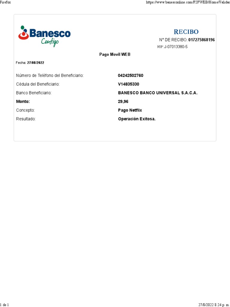 Comprobante de Pago Netflix Mes de Agosto 2022 PDF