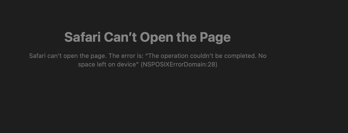 I continually get a no room left on the device error while using safari on a daily basis. No space left on device (nsposixerrordomain:28) safari randomly started to fail to open websites. I continually get a no room left on the device error while using safari on a daily basis. Encountering the no space left on device error in safari.