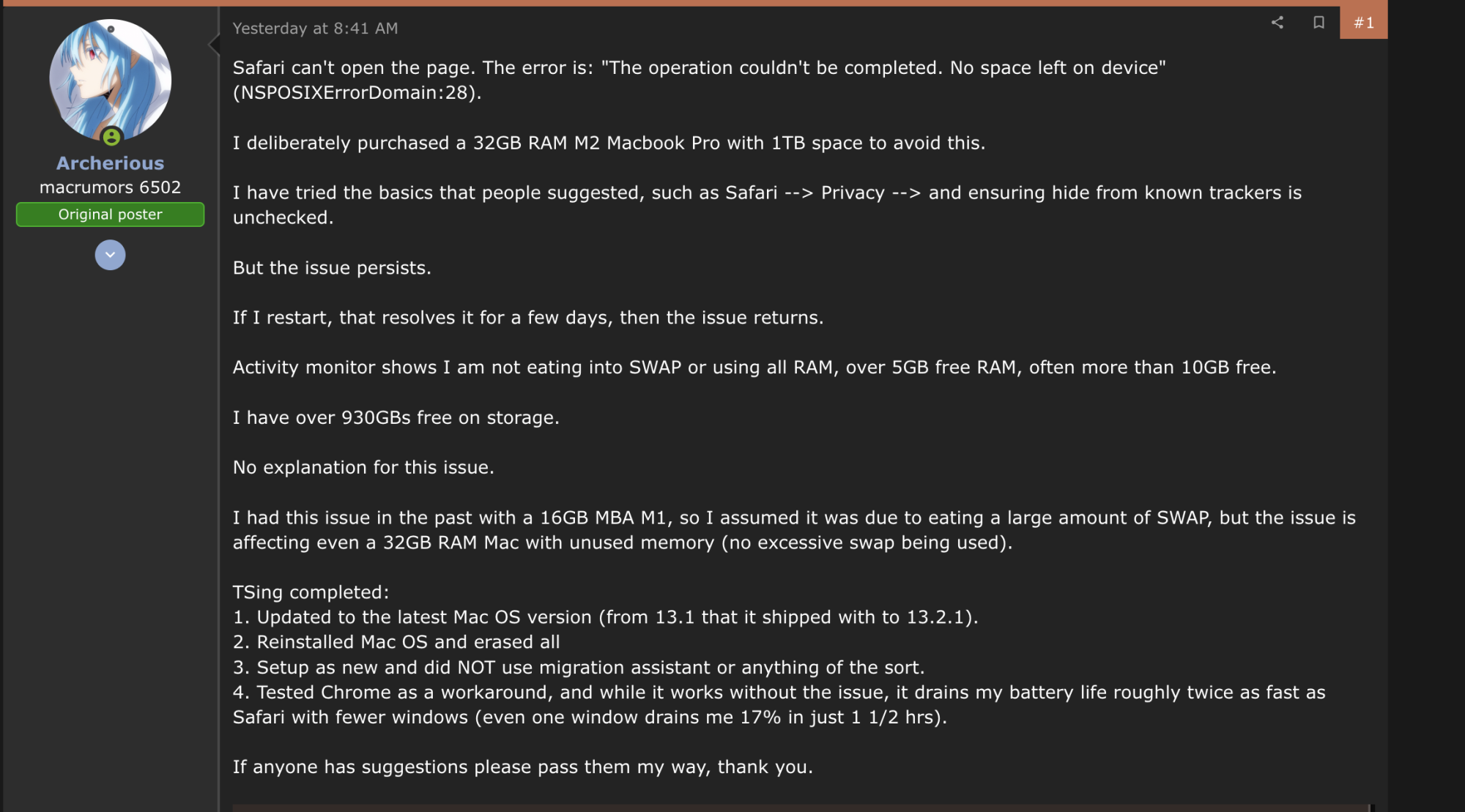 No space left on device (nsposixerrordomain:28) safari randomly started to fail to open websites. I clear all the cookies and website data. I clear all the cookies and website data. I continually get a no room left on the device error while using safari on a daily basis.
