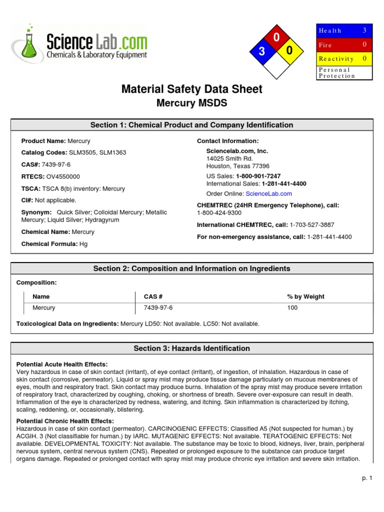 Mercury safety data sheet according to the federal final rule of hazard communication revised on 2012 (hazcom 2012) View or download the mercury msds (material safety data sheet) or sds for 104404 from merck. Mercury is highly toxic, irritating, and causes sensitization and neurological symptoms. All information and instructions provided in this material safety data sheet in respect of the.